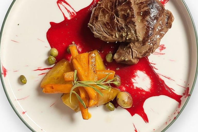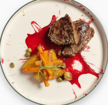 (Pancar sos ve humus püre eşliğinde 180 Gr bonfile ile eşlik eden beybi sebzeler ve özel yağımız.)